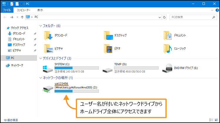 ホームドライブ全体には、ユーザー名が付いたネットワークドライブからアクセスできます。