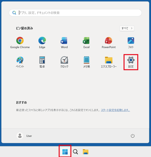[スタートボタン] をクリックして、[設定] アイコンをクリックします。