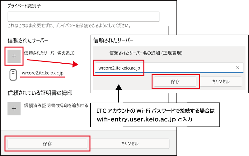 信頼されたサーバー名の追加の [+] をクリックし、wrcore2.itc.keio.ac.jp と入力して [保存] をクリックし、[保存]をクリックします。