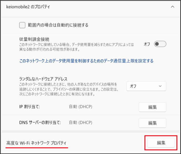[高度なWi-Fiネットワークプロパティ] の [編集] をクリックします。