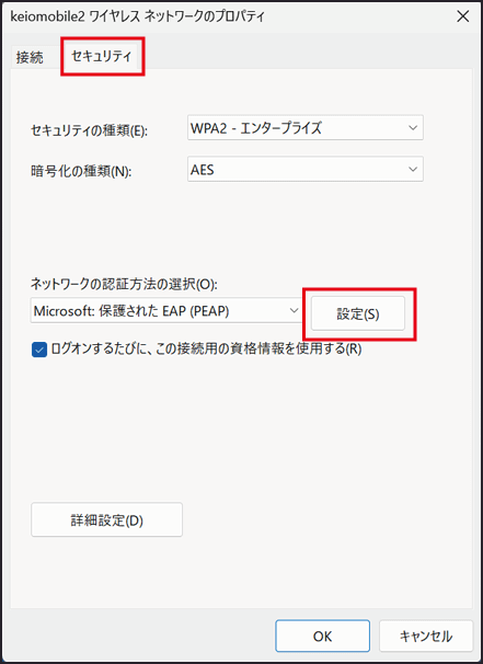 [セキュリティ] タブを選択し、[設定] をクリックします。