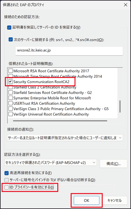 [信頼されたルート証明書機関] - [Security Communication RootCA2] にチェックを入れます。
