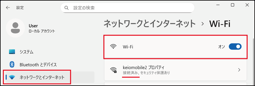 [ネットワークとインターネット] - [Wi-Fi] をクリックし、keiomobile2 が [接続済み] と表示されている事を確認してください。